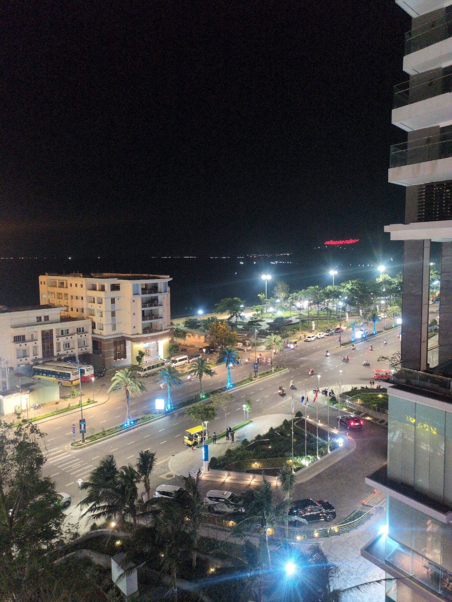 An elevated nighttime photograph depicts a bustling urban street scene in South Quy Nhon Ward, Vietnam. The image captures a wide, multi-lane asphalt road, divided by a landscaped median strip contain…read more