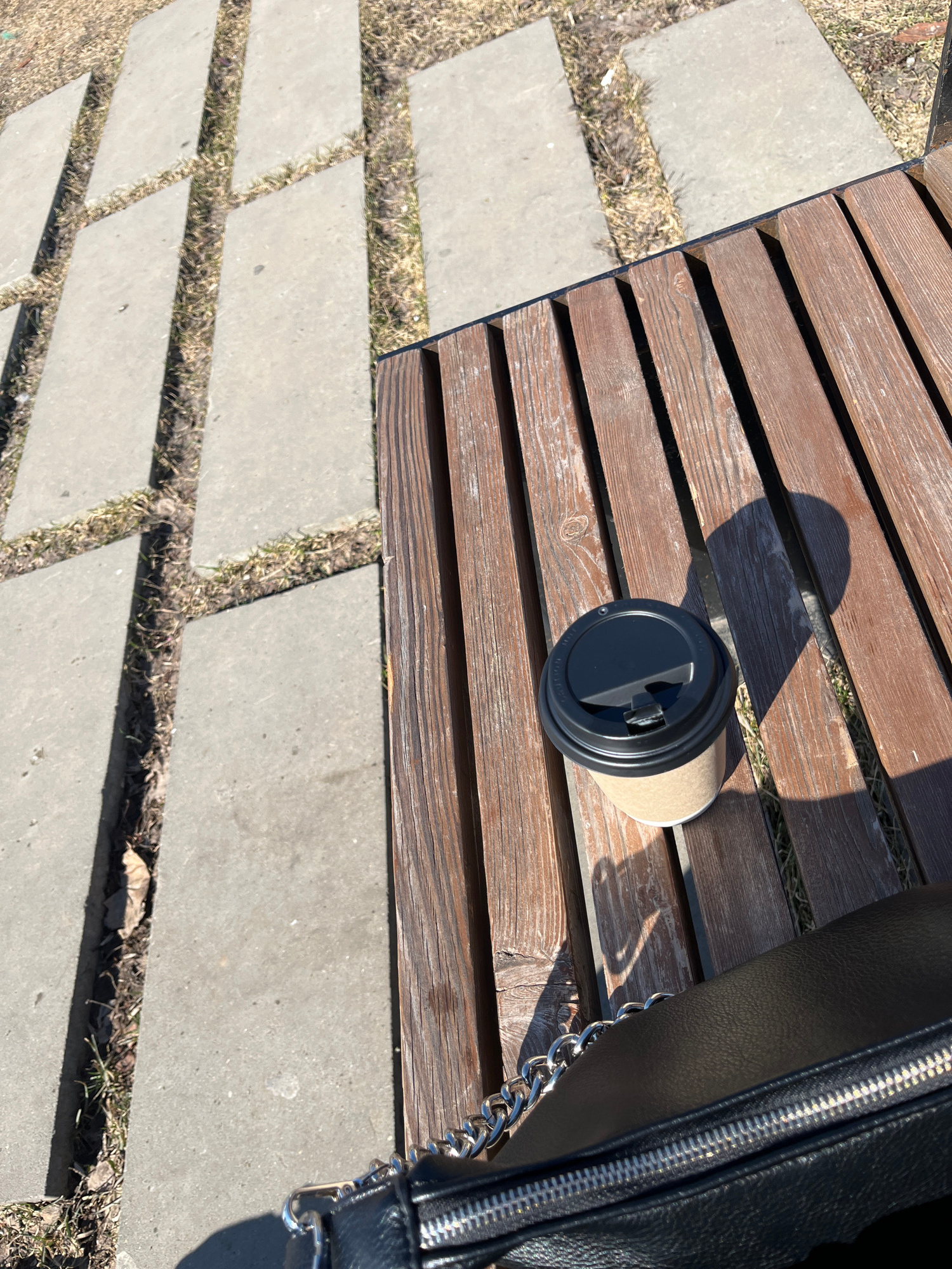 A tan paper coffee cup with a black plastic lid sits on a wooden bench. To the right of the coffee cup is a black leather purse with a silver chain. The bench is made of parallel wooden planks. The be…read more