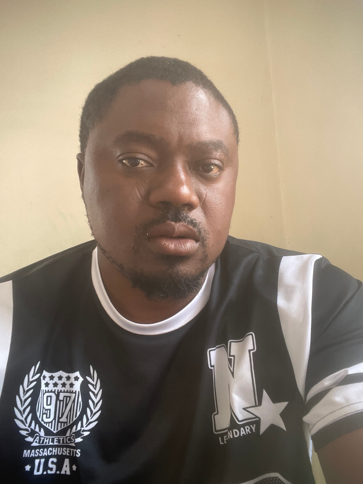 The media file displays a self-portrait of an adult man, likely taken indoors in Jos, Nigeria. The image is rotated 90 degrees clockwise, showing the man's head tilted towards the left, suggesting the…read more