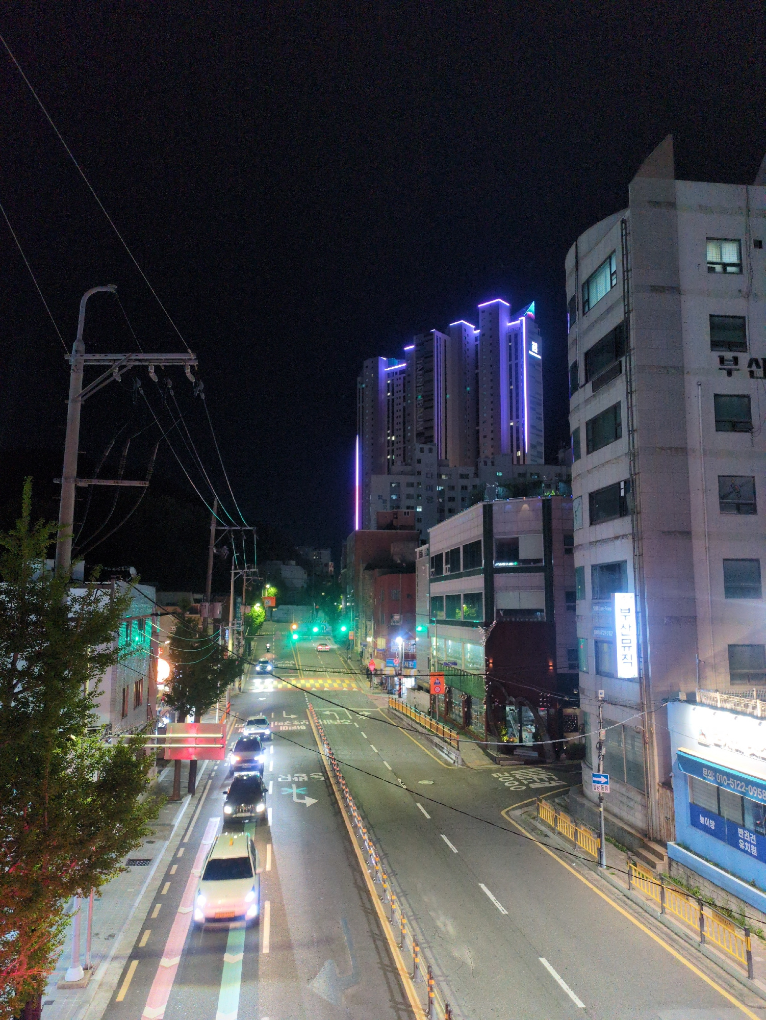 The image depicts a nighttime scene in Busan, South Korea. A multi-lane road is visible, with several cars traveling along it. Tall buildings line the street, including one with blue and purple neon l…read more