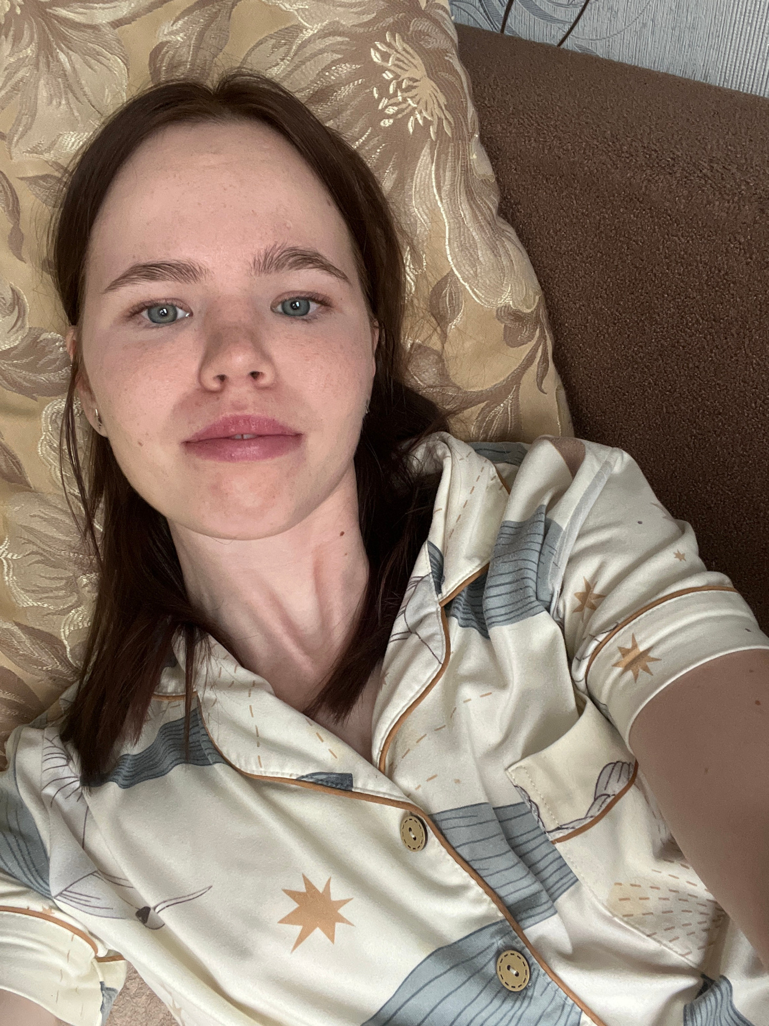 The image presents a close-up portrait of a young woman lying down indoors in Chaikovsky, Russia. She is positioned on her back, looking directly at the camera with a calm, neutral expression. She has…read more