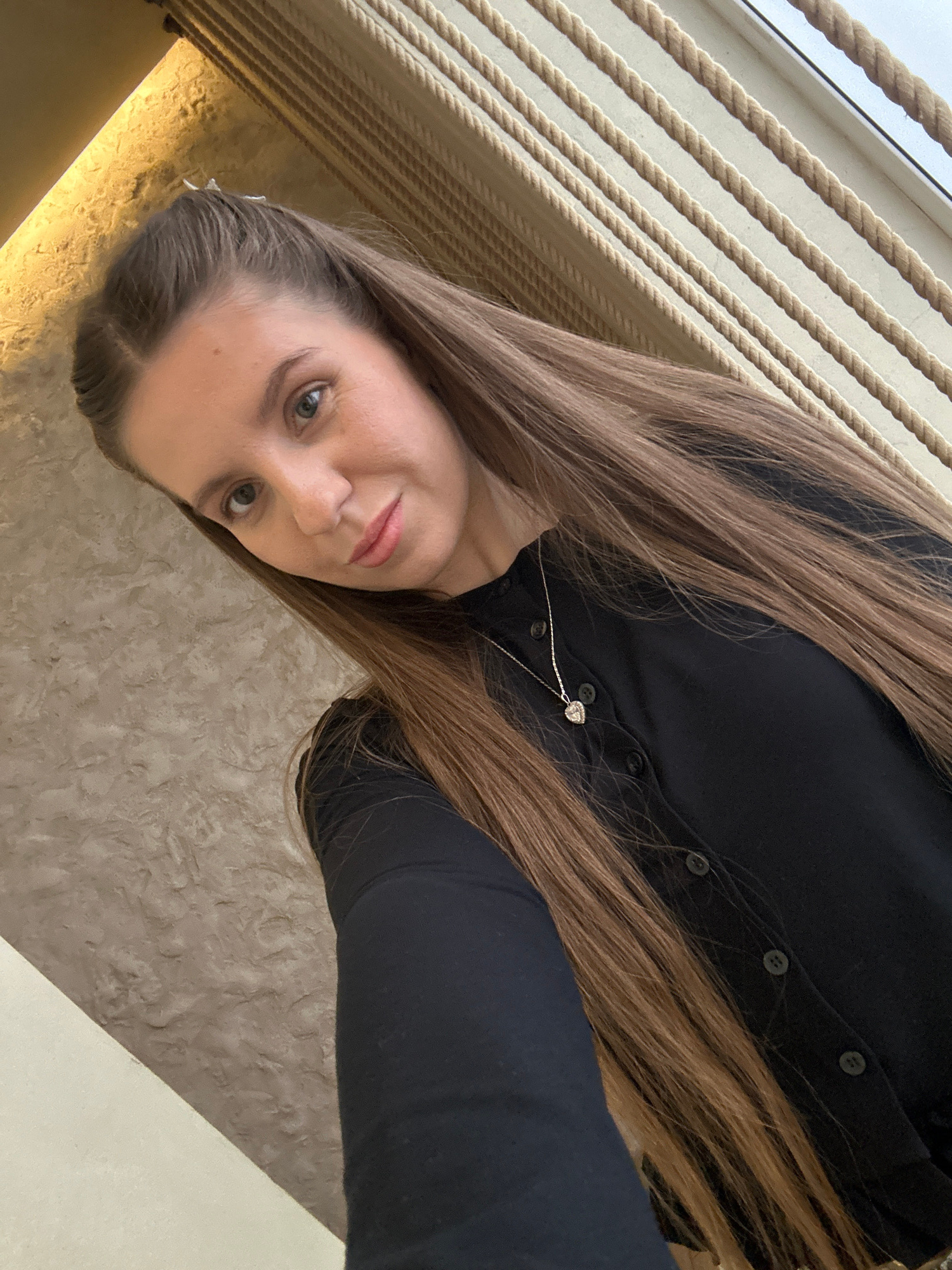 A woman with long, straight, light brown hair is the central subject of this image, captured from a low, upward-facing angle. She is positioned diagonally, with her head in the lower left quadrant and…read more