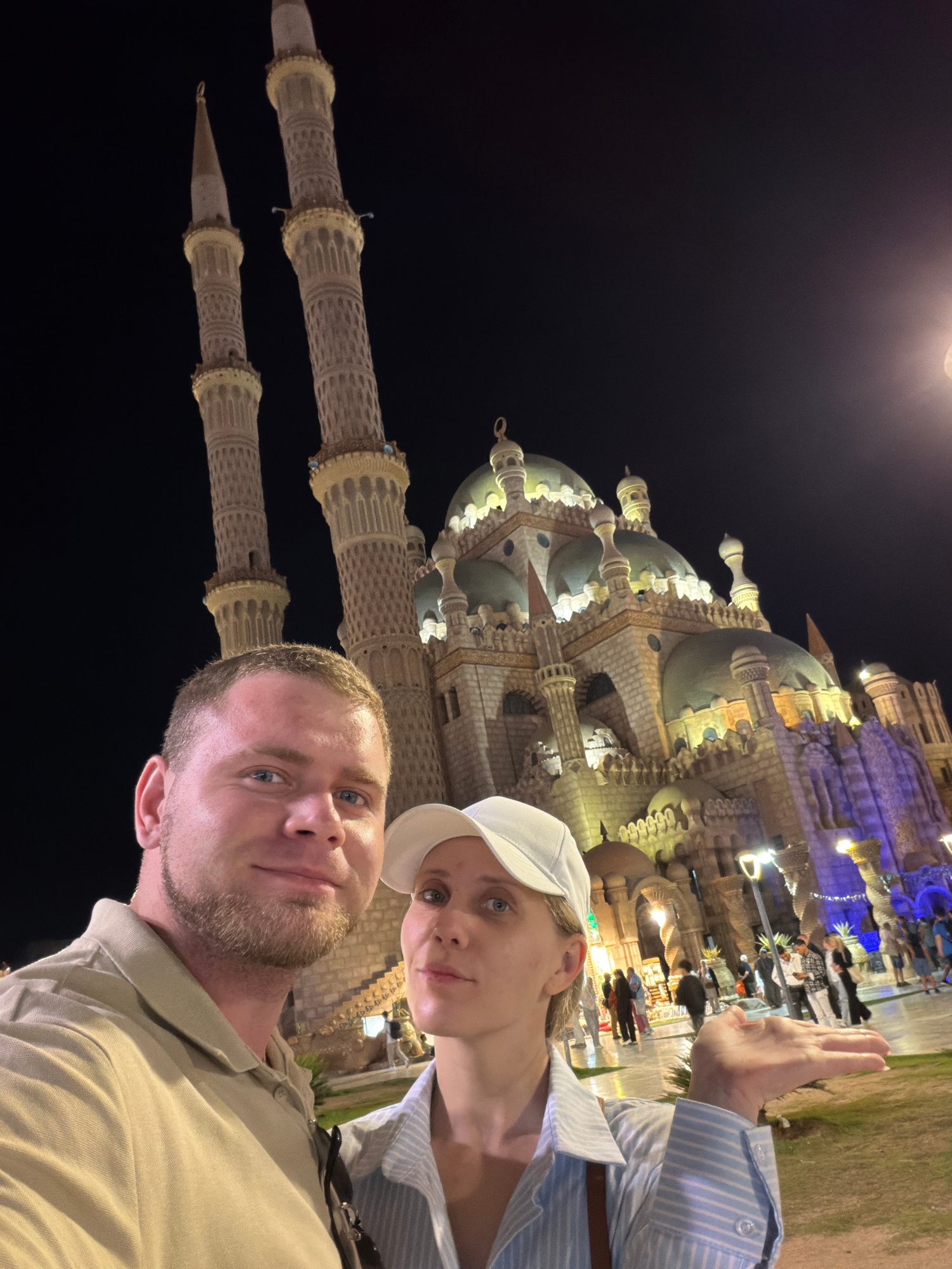 The image depicts two individuals posing for a photograph at night in front of the illuminated Al Sahaba Mosque, located in Sharm El Sheikh, Egypt. In the foreground, a male with short hair and a ligh…read more