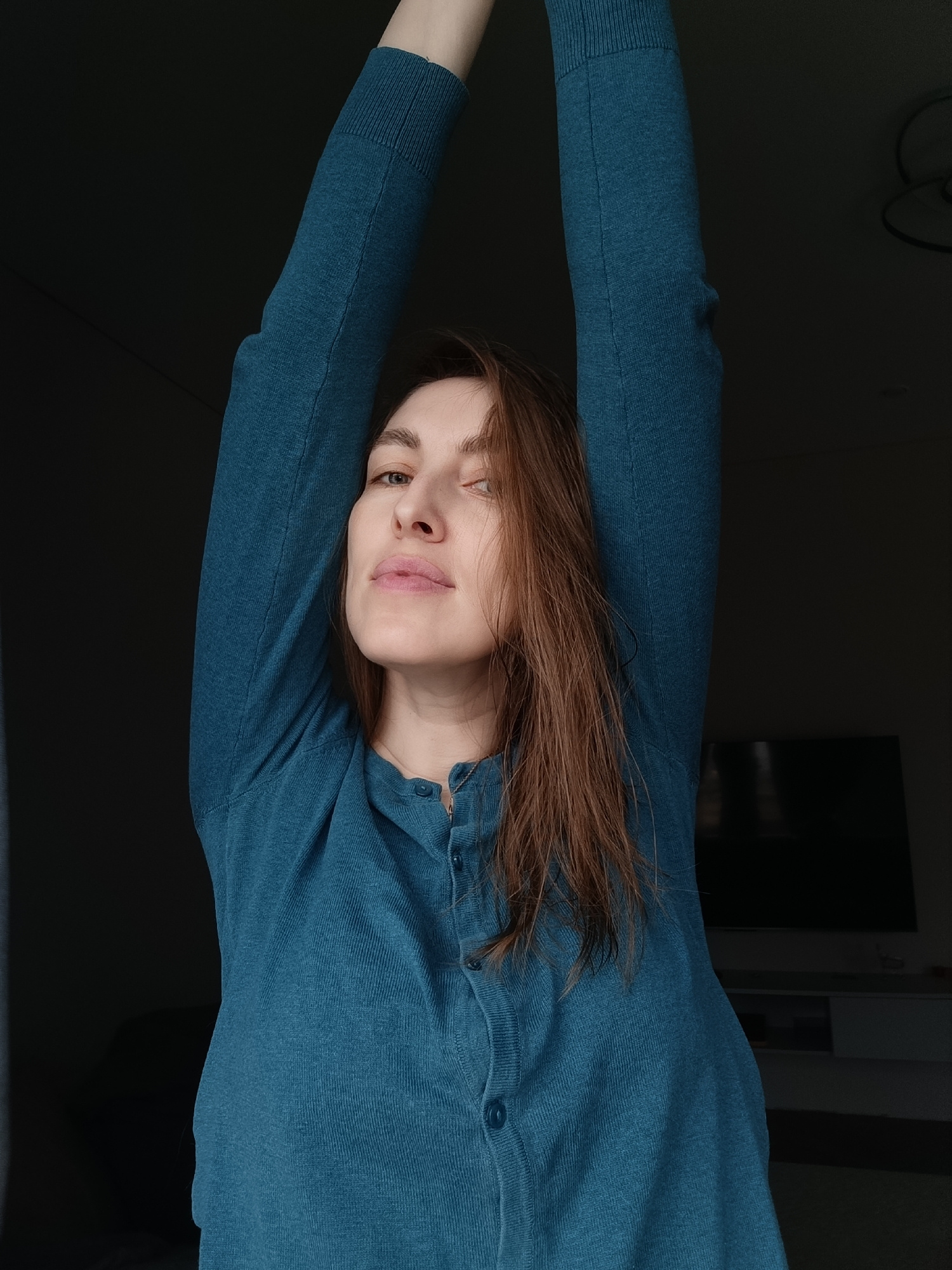 A woman with shoulder-length brown hair is the central subject of the image, wearing a long-sleeved, blue-green button-down cardigan. Her arms are raised above her head, suggesting a stretching or rea…read more