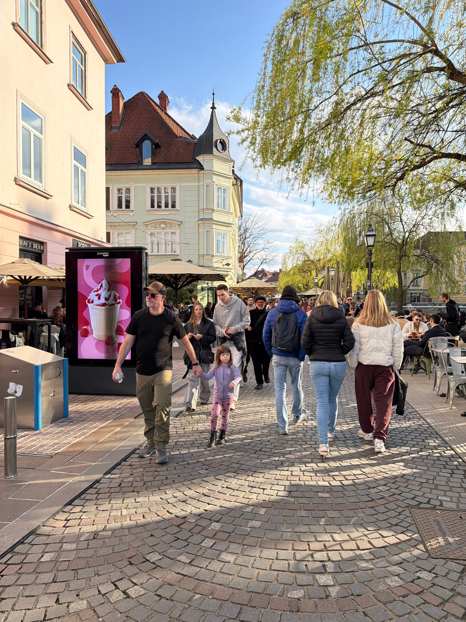 This image shows a street scene in Ljubljana, Slovenia. A row of people is walking along a cobblestone path, with a man closest to the foreground. He is wearing a black shirt, green pants, a hat, and…read more