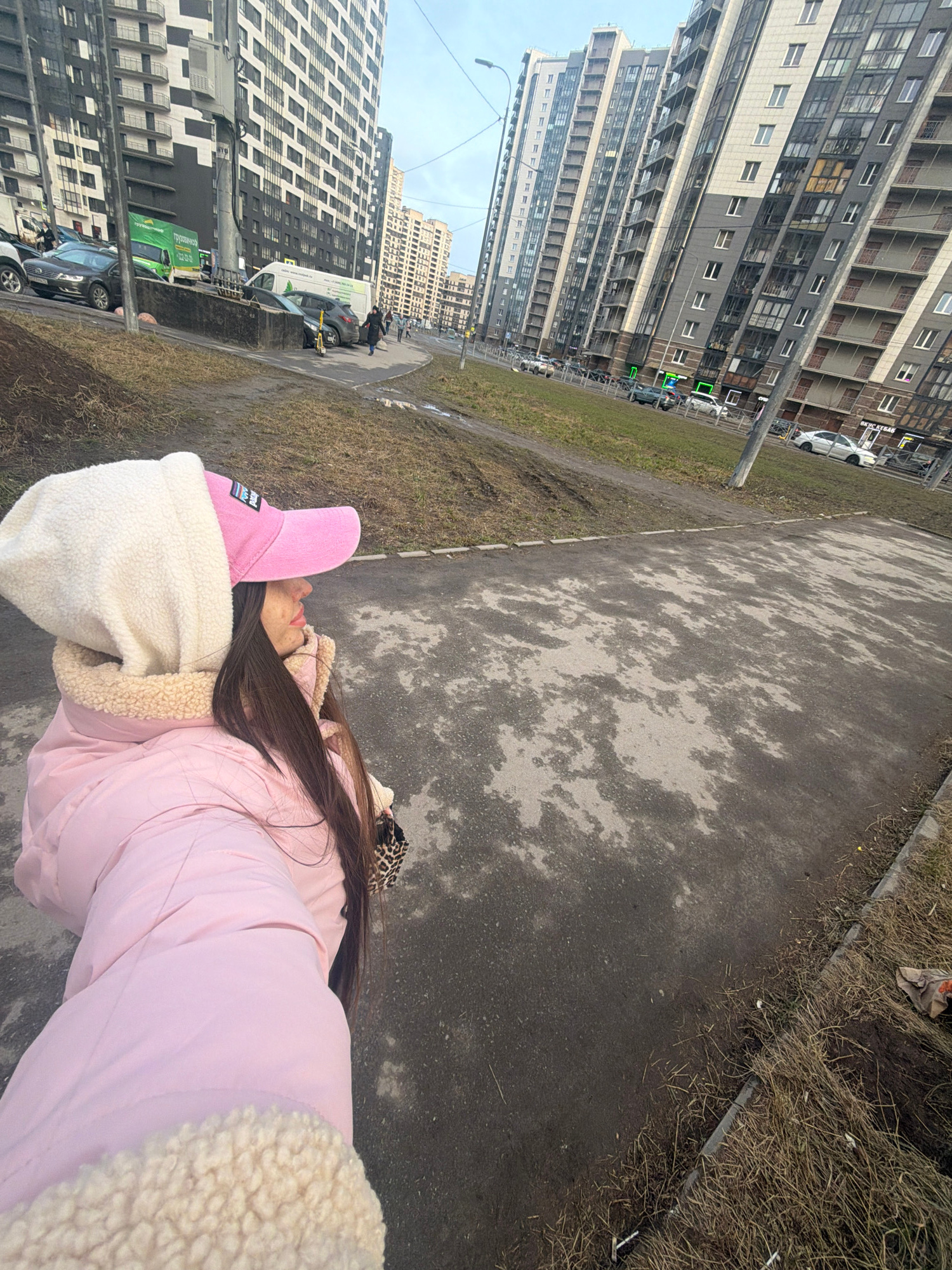 A high-angle shot depicts a person lying on a concrete walkway beside a grassy area in a city setting. The person is wearing a pink jacket with a white faux-fur lined hood and a pink hat. Long, brownβ¦read more