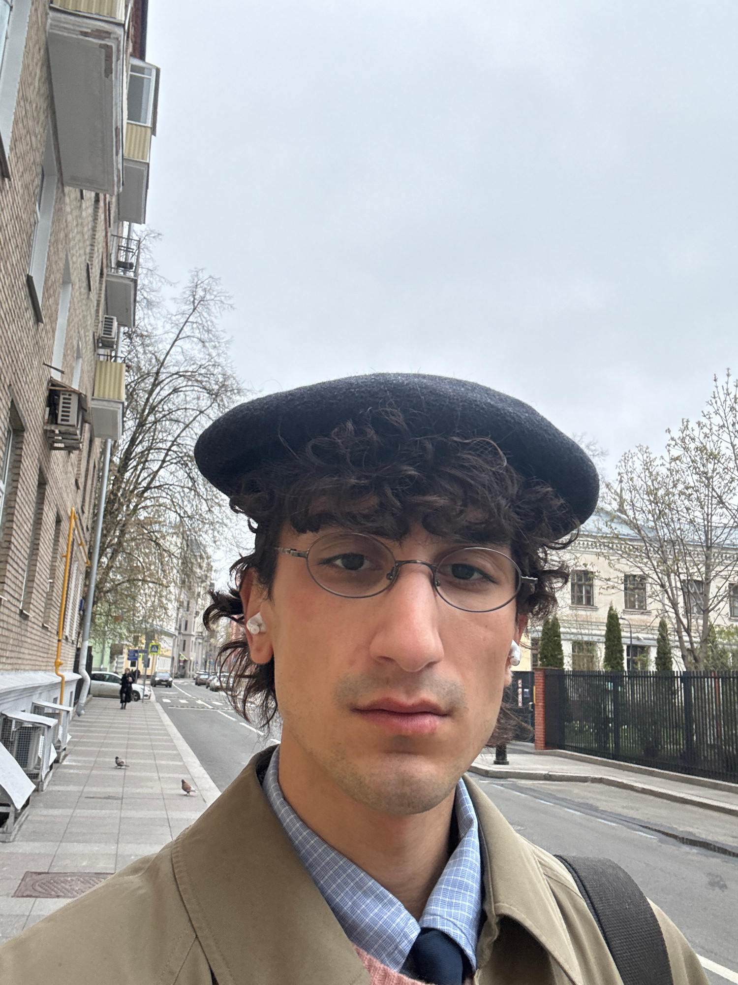 A selfie features a young man with dark, curly hair, wearing a black beret, round wire-rimmed glasses, a light blue checkered shirt, and a tan trench coat. He has white wireless earbuds in both ears a…read more