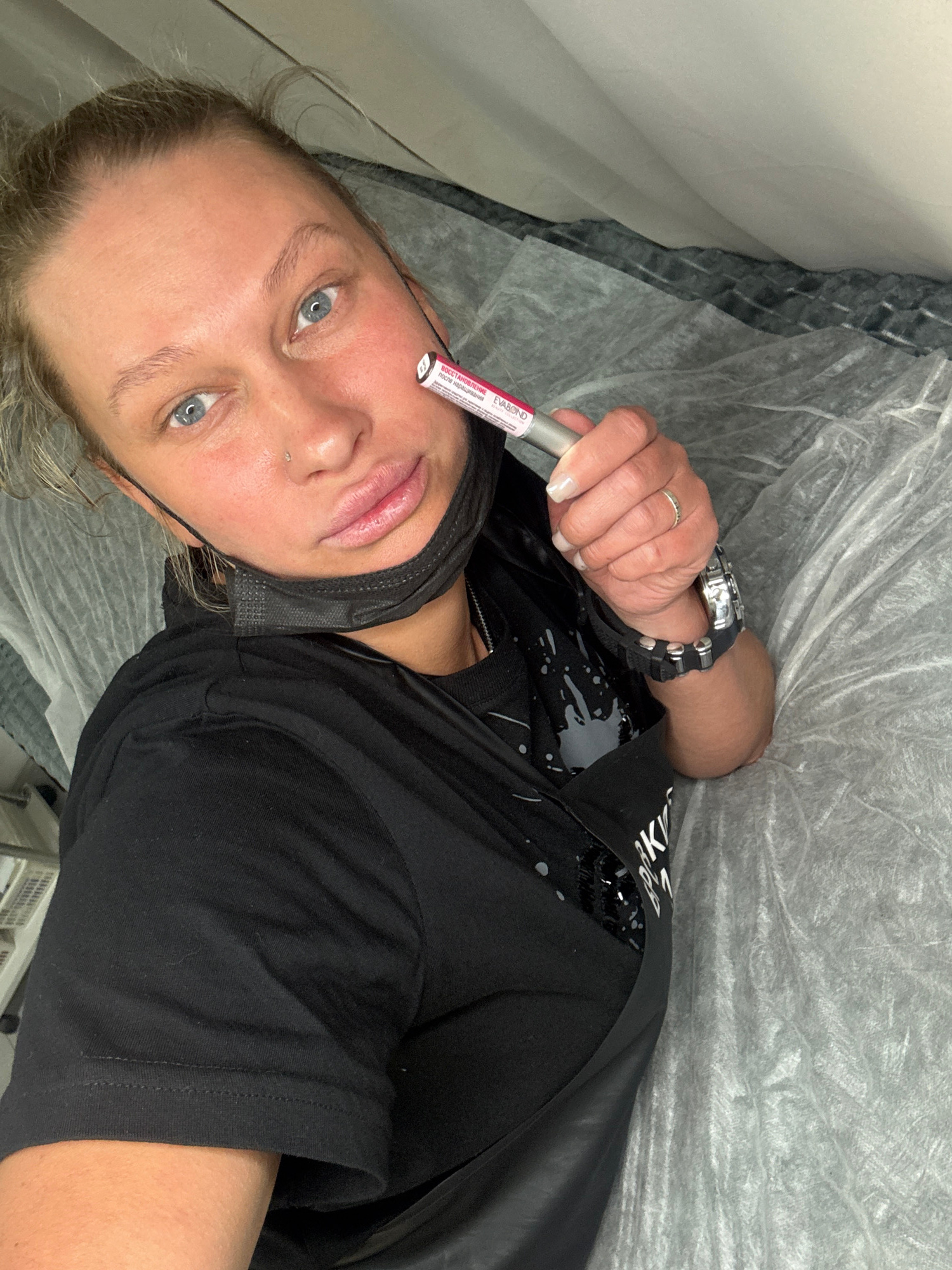 A woman with blond hair is lying on a surface covered with a wrinkled, translucent material. She is wearing a black t-shirt, a black face mask pulled down below her chin, and a watch on her left wrist…read more