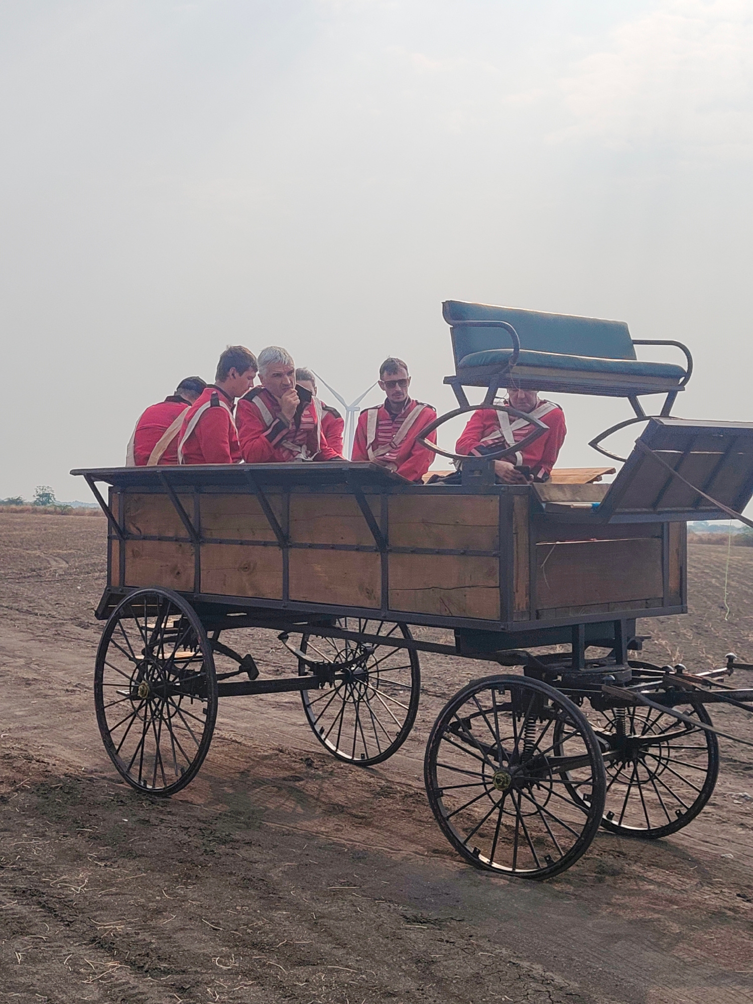 An outdoor scene in Kottalapalli, India, depicts five adult individuals in historical red uniforms with white cross belts and sashes, situated within a four-wheeled, dark-colored wooden cart on a dirt…read more