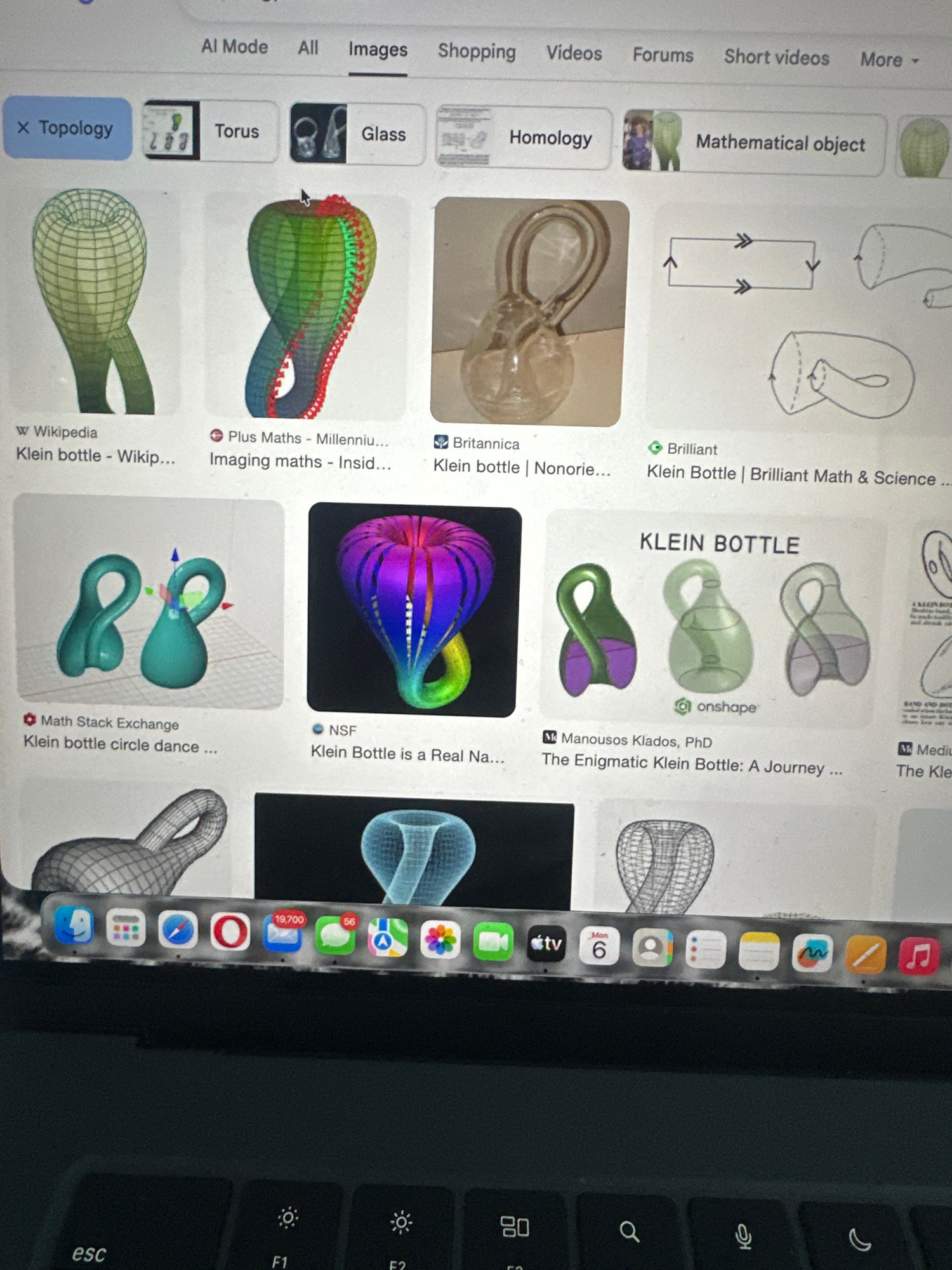 The image is a screen capture of a Google Images search for "Topology," specifically showing search results related to "Klein bottles." The interface of the search engine, including the "Al Mode," "Im…read more