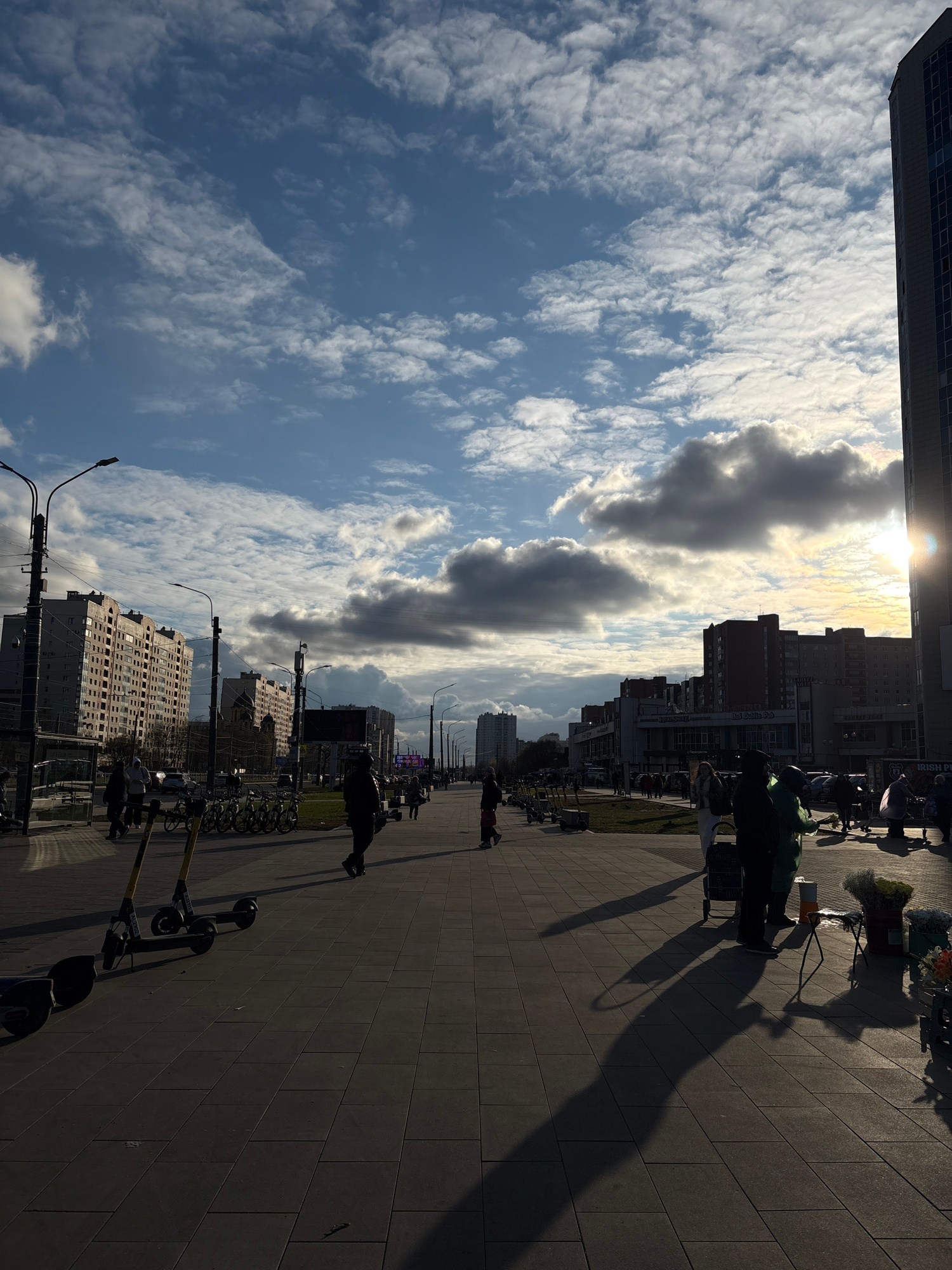 The image depicts a street scene in what appears to be Saint Petersburg, Russia. The view is oriented with the sky and clouds taking up a significant portion of the frame. The sky is blue with numerou…read more