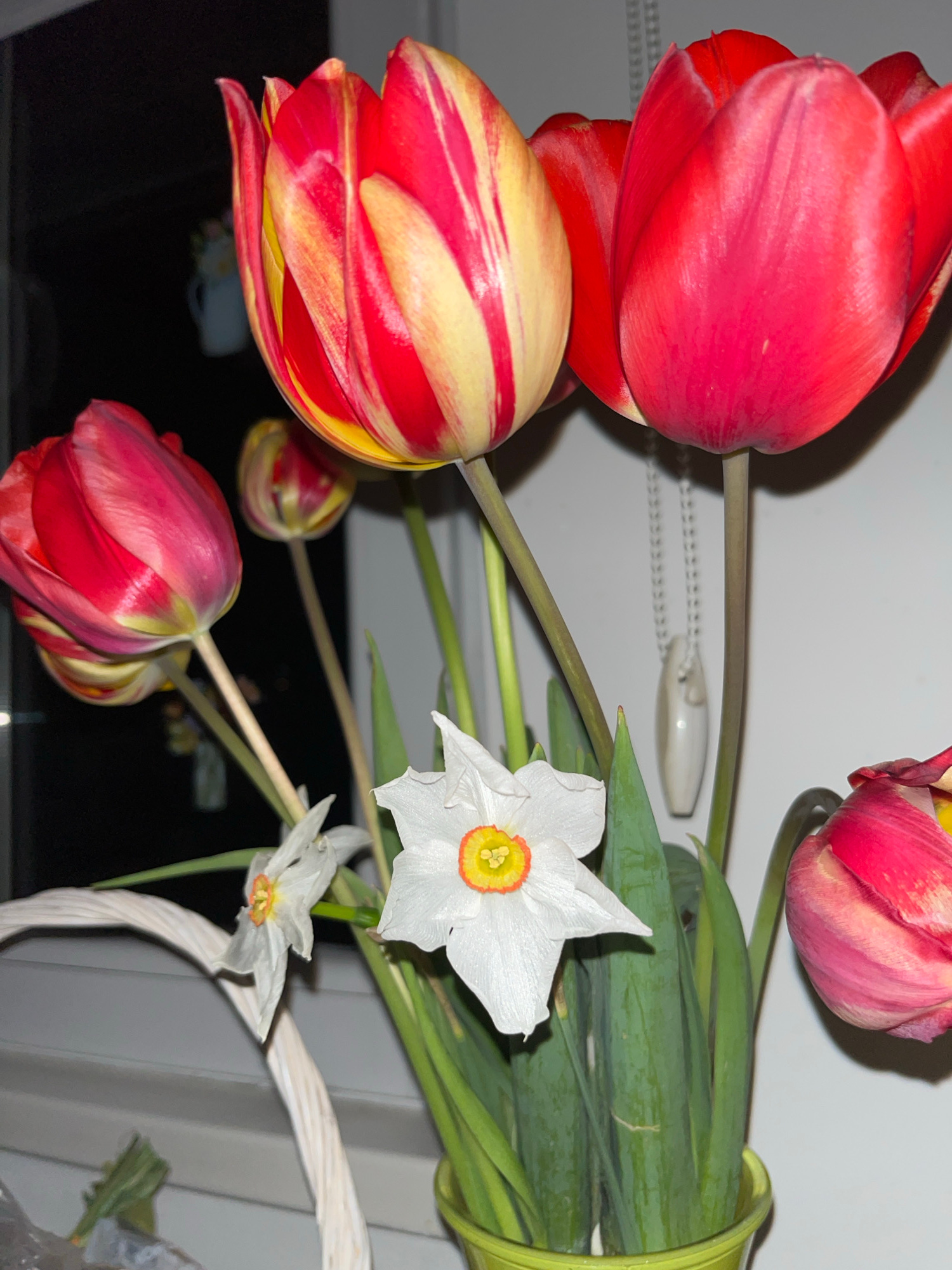 This media file captures an indoor still life of a vibrant flower bouquet, likely taken in Sopot, Bulgaria. The arrangement prominently features several tulips and daffodils. Red tulips are dominant,…read more