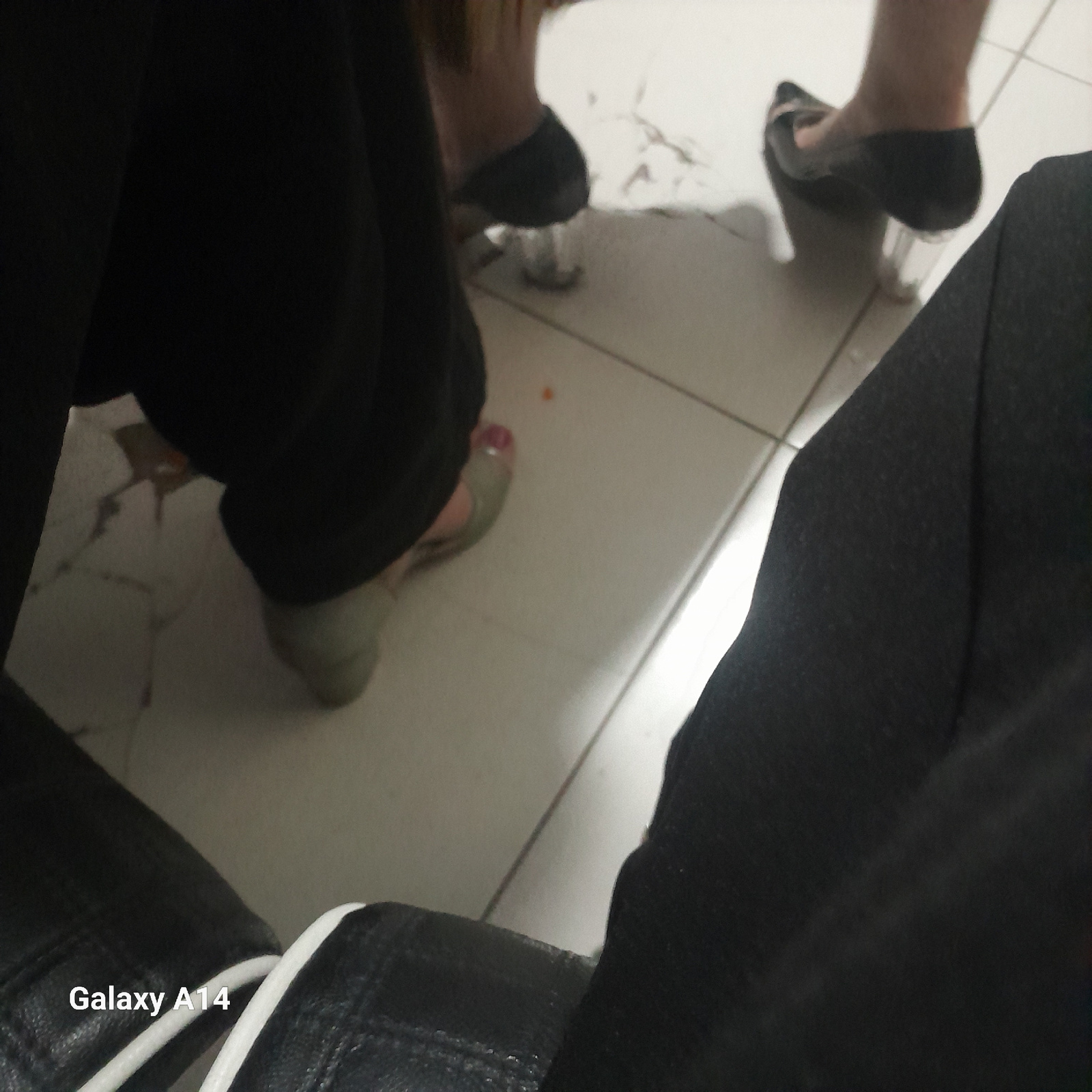 The image captures a low-angle, tilted view of the lower legs and feet of multiple individuals on a light-colored tiled floor, suggesting an indoor setting. In the mid-left portion, a bare foot with…read more