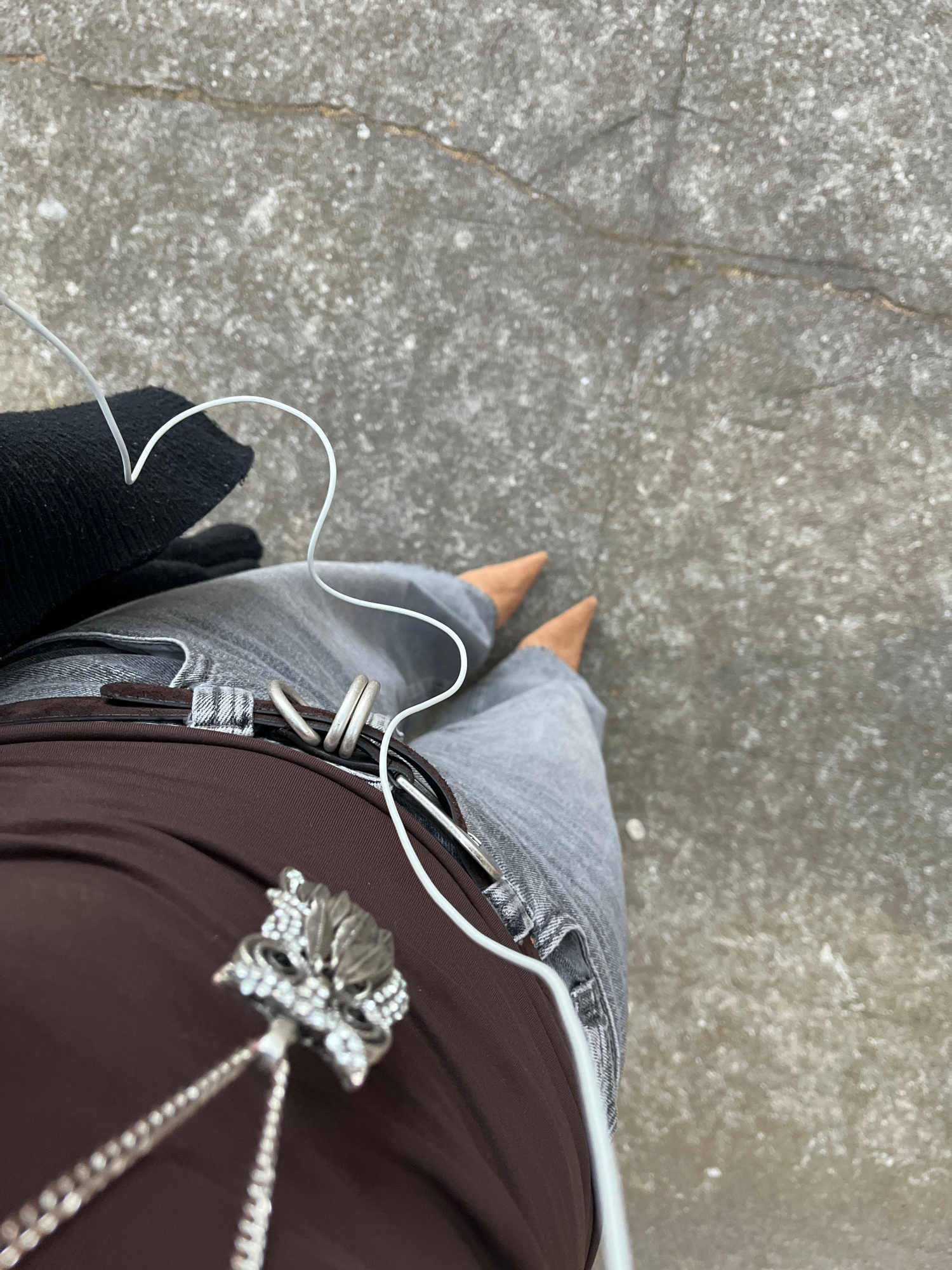 The image shows a person's perspective looking down at their own feet. They are standing on a gray, textured concrete surface with cracks, possibly a sidewalk. The person is wearing gray jeans, a brow…read more