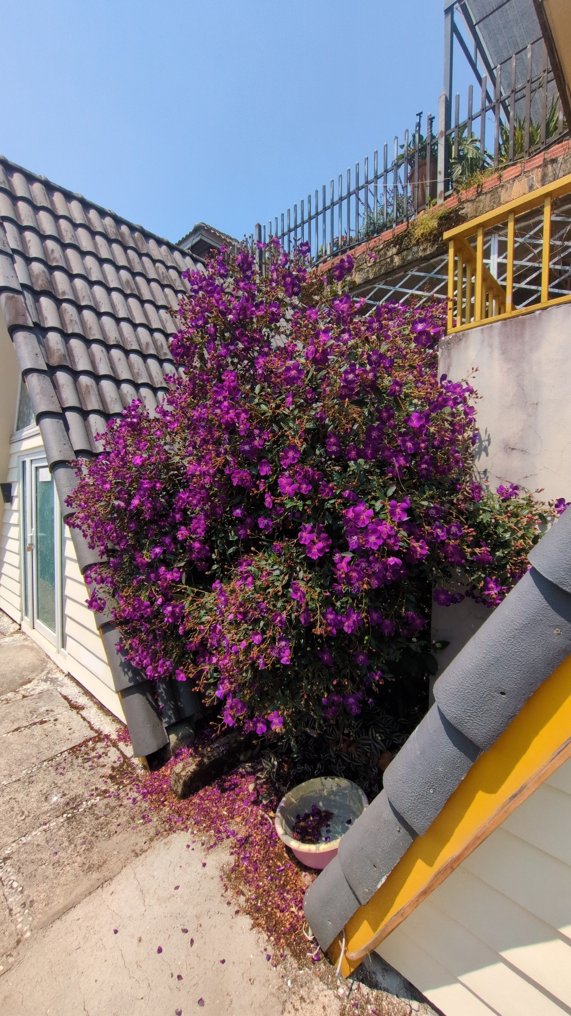 The image shows a building in Da Lat, Vietnam. A large bush with purple flowers dominates the scene, spilling over the edge of a building's roof and onto the ground. A small window is visible beneath…read more