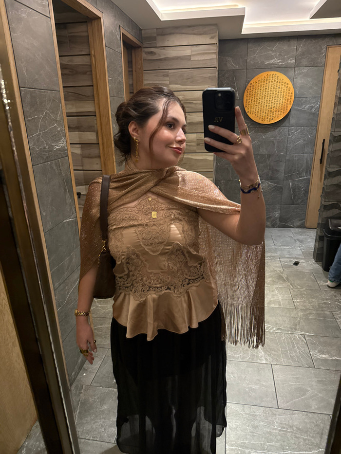 A woman takes a selfie in a mirror. She wears a gold, lace-trimmed top and a black skirt or dress. She has a gold shawl with fringe over her shoulder and several bracelets on her arm. A small gold penβ¦read more