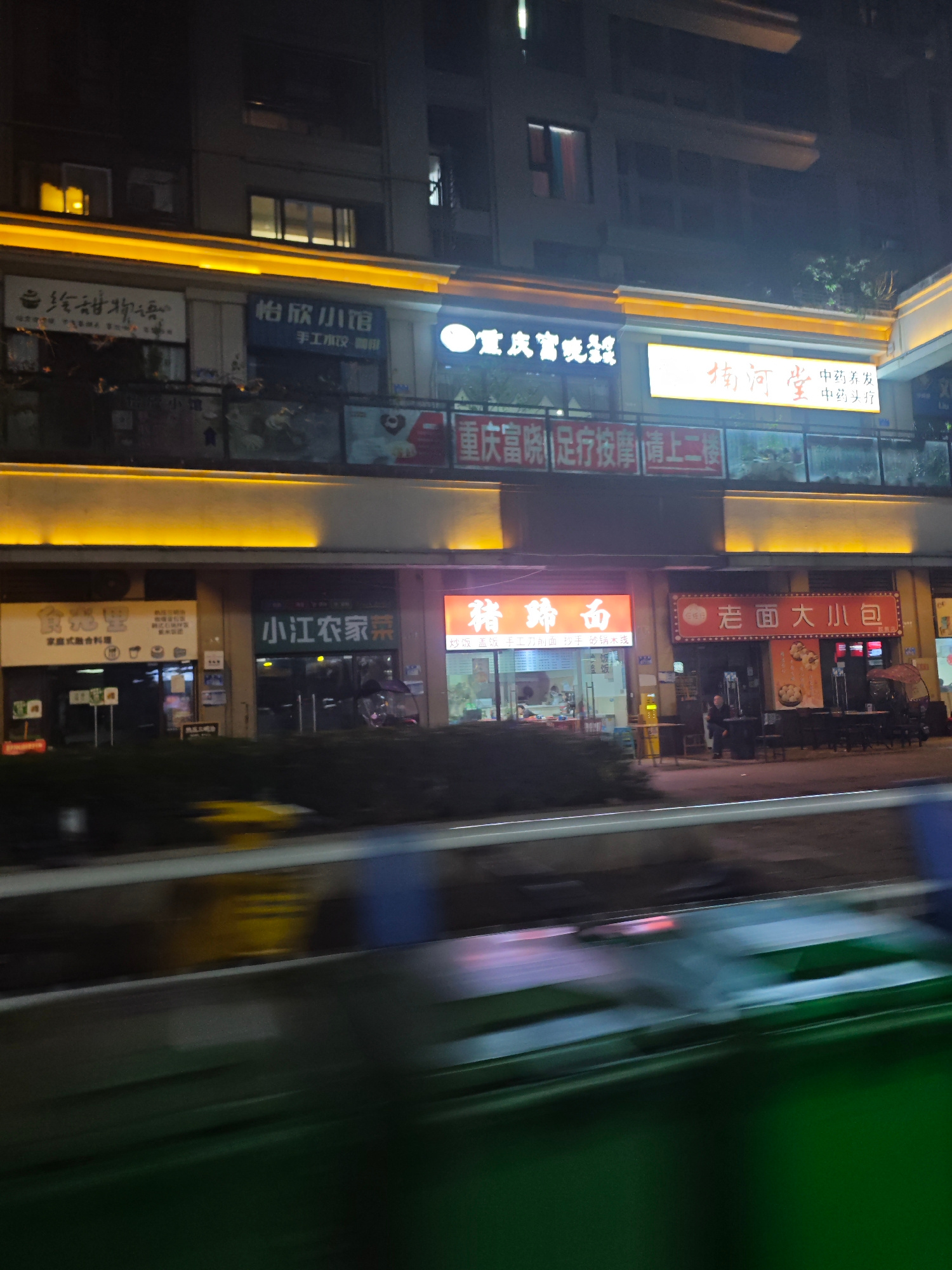 The image shows a street scene at night in the Chongqing High-tech Zone, China. The street is lined with commercial establishments with brightly lit signs. The signs, written in Chinese, indicate vari…read more
