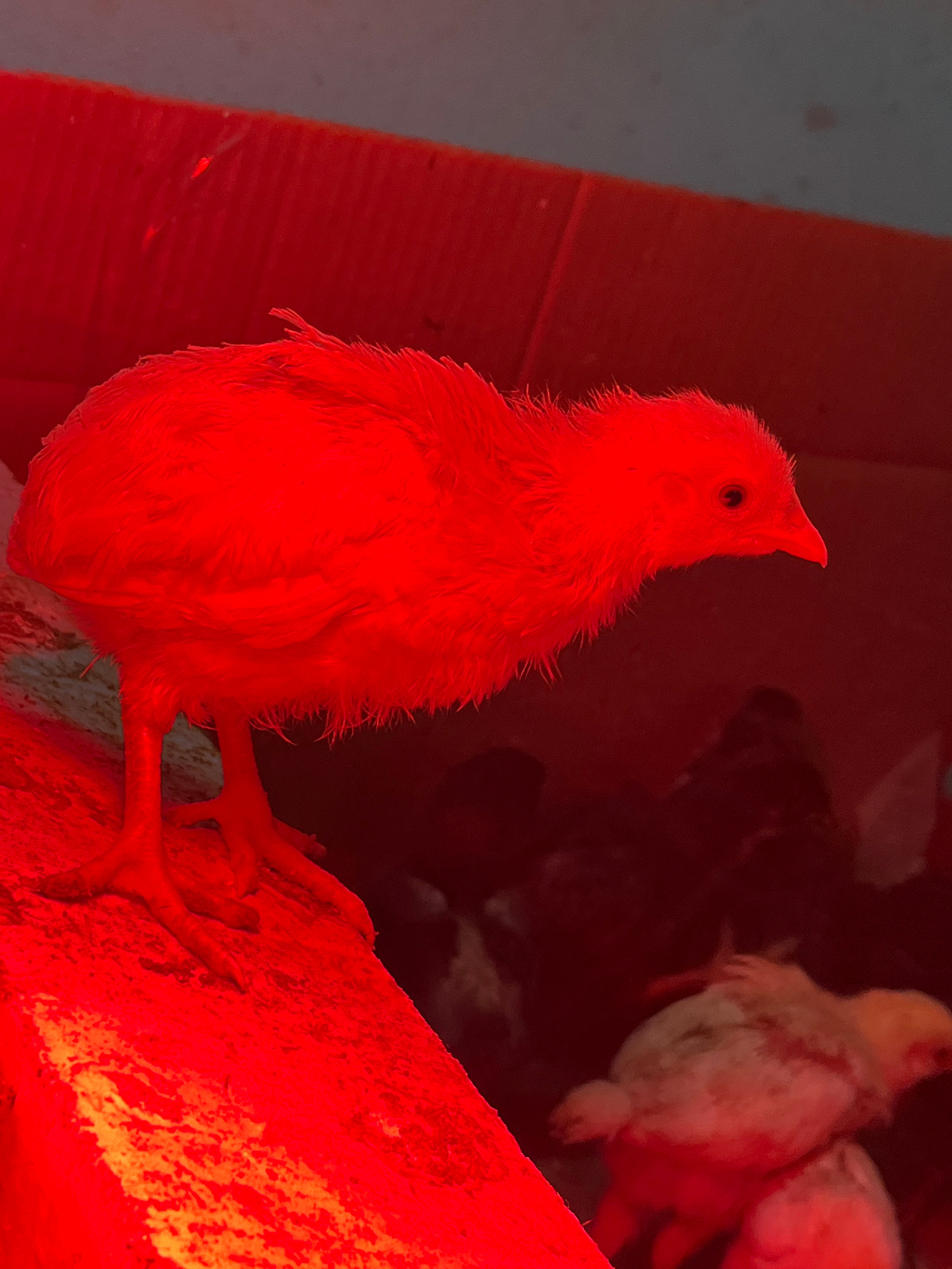 A baby chick stands under a red heat lamp. The chick is light-colored, likely yellow or white. Several other chicks are visible in the background, some darker than the chick in the foreground. The sur…read more