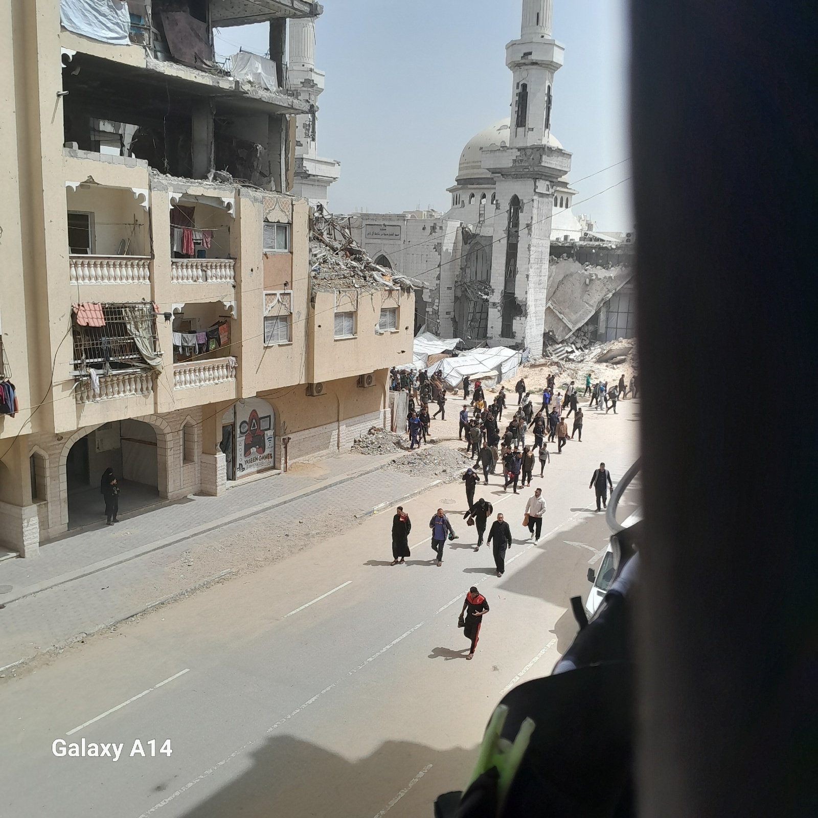 The image, apparently taken from an elevated position, depicts a scene of devastation in what appears to be an urban environment. The location is identified as Khan Yunis, Palestinian Territory. The i…read more