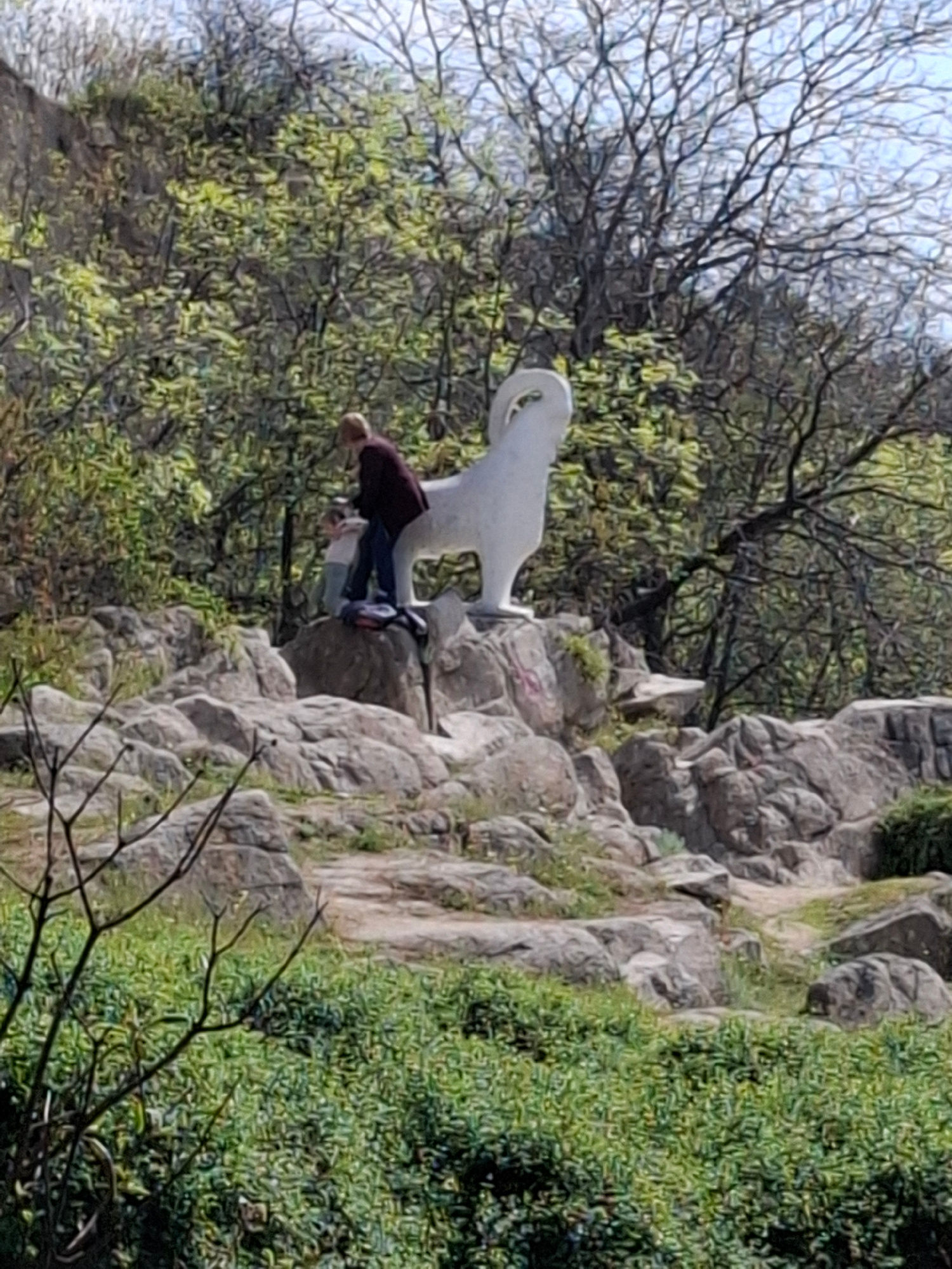 The image shows a person standing next to a white swan statue in a park in Plovdiv, Bulgaria. The statue stands on a rock outcropping next to a path. The person, wearing a dark shirt and blue jeans, a…read more