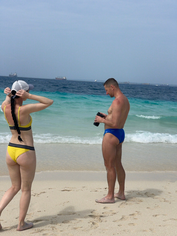 An outdoor scene depicts two individuals on a sandy beach in Zanzibar, Tanzania, facing the ocean. A female, positioned on the left, stands with her back to the camera, wearing a yellow two-piece biki…read more