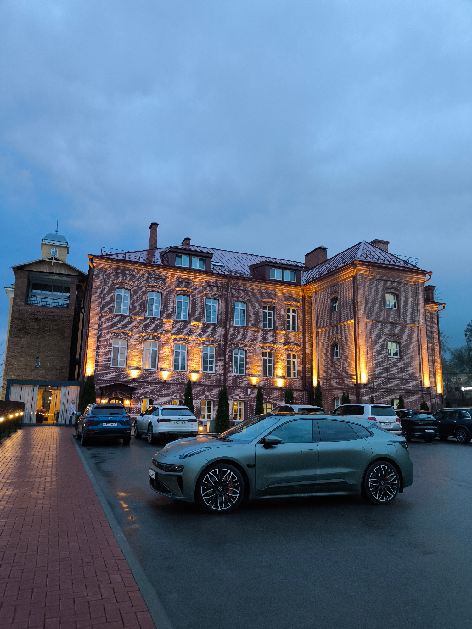 The image shows a brick building with multiple lit windows in Smolensk, Russia. The architecture includes a tower structure to the left of the main building. Several vehicles are parked in front, incl…read more