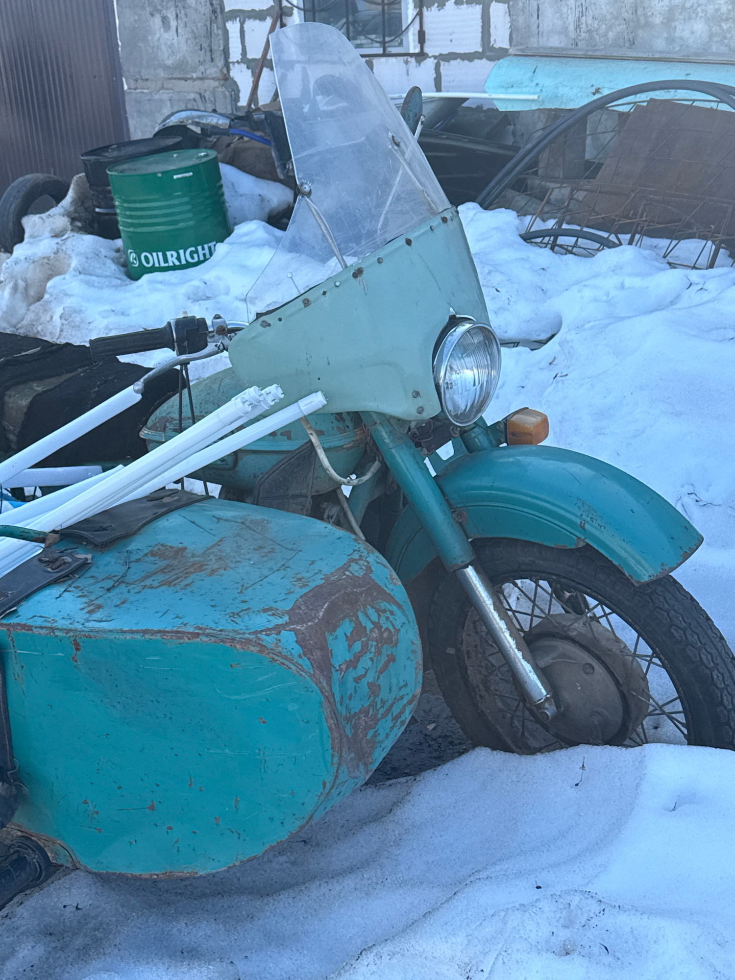 The image depicts a teal-colored motorcycle with an attached sidecar, stationary on snow-covered ground in Elovo, Russia. The motorcycle and sidecar show signs of age and wear, with chipped paint reve…read more