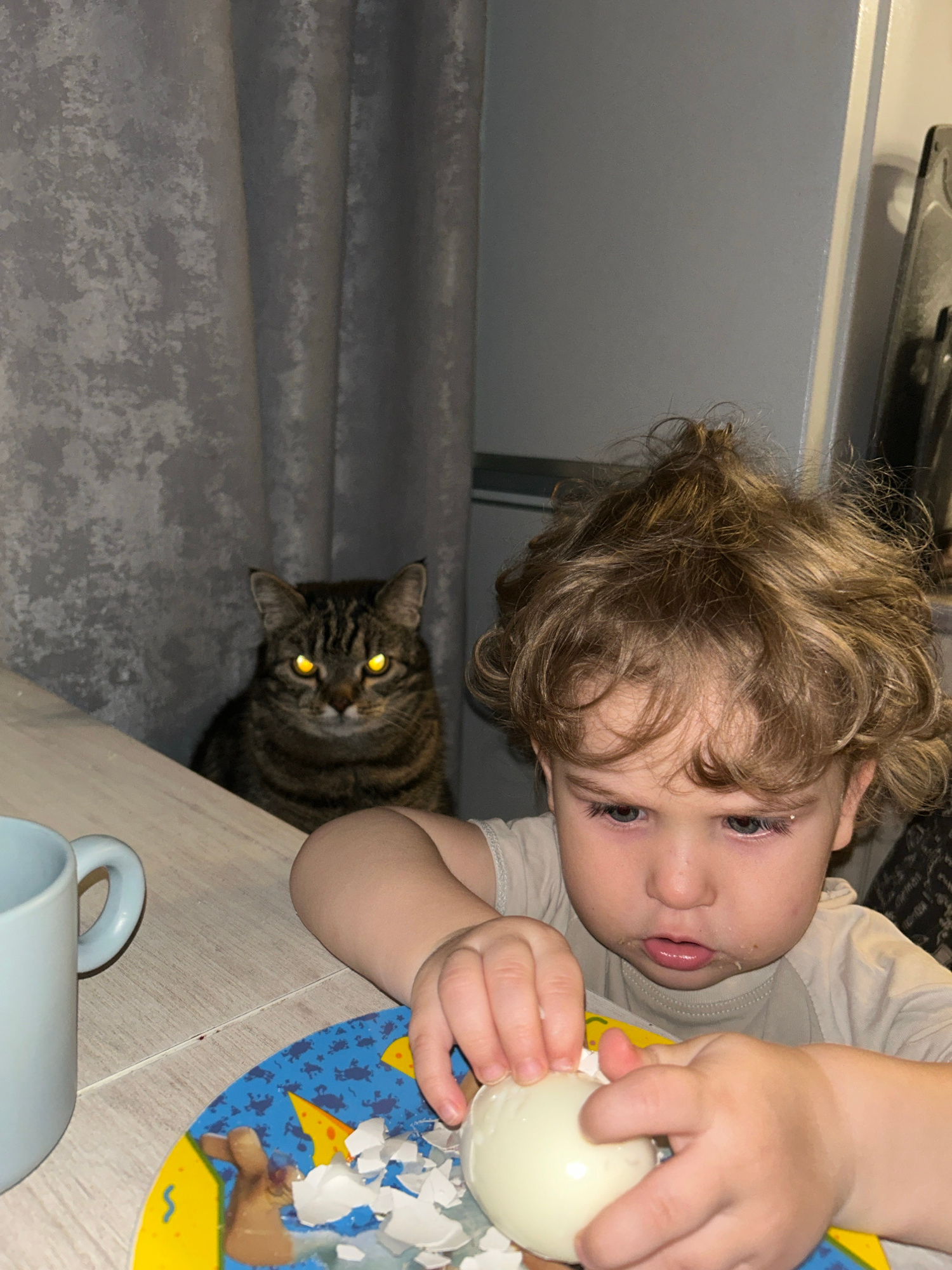 A toddler with curly blond hair is peeling a hard-boiled egg on a blue and yellow patterned plate. A tabby cat with glowing yellow eyes watches from behind. A pale blue mug sits on the table near the…read more