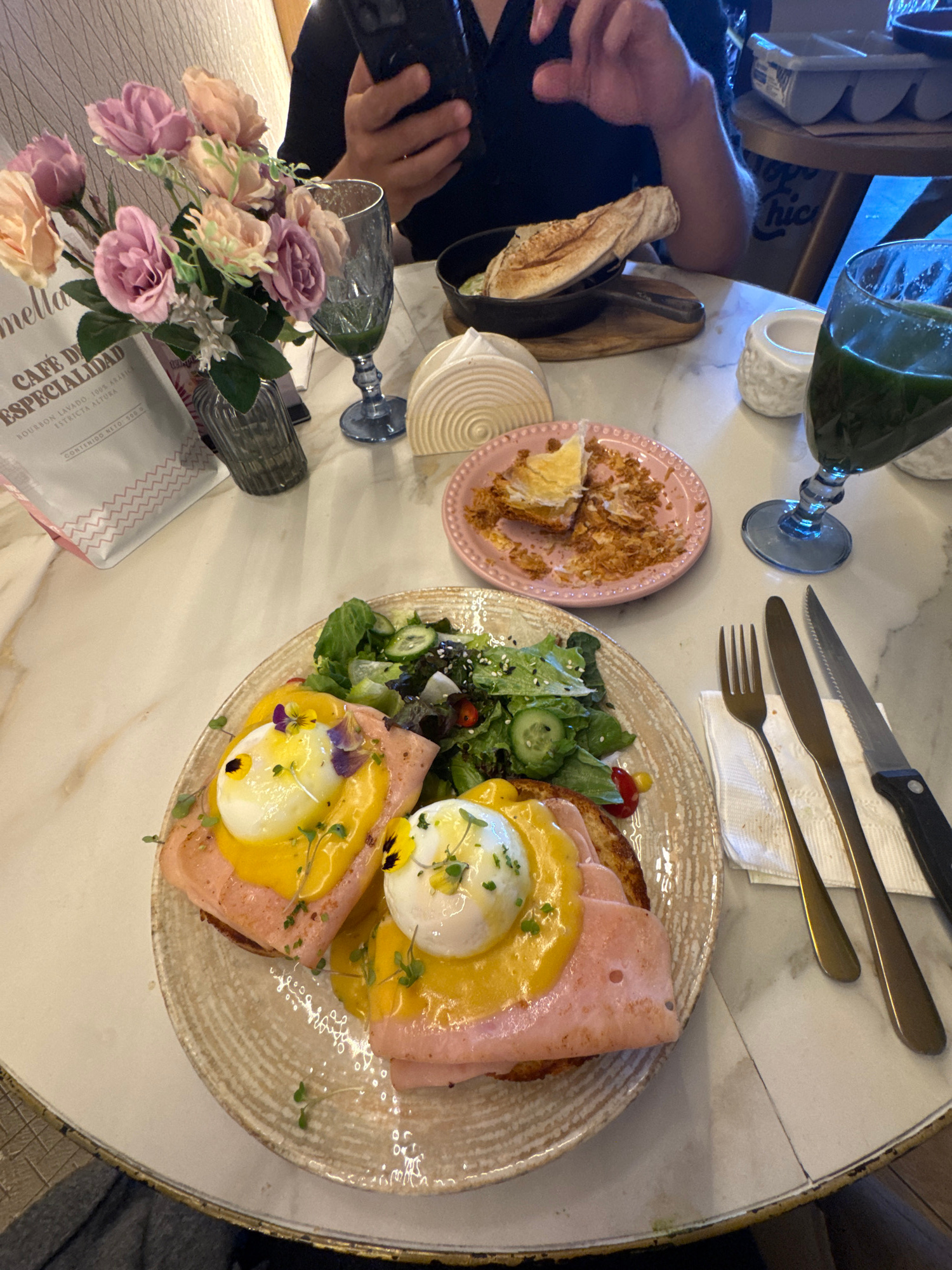 Here's a detailed description of the image: **Scene:** A top-down shot capturing a dining table setup, possibly in a restaurant or café. **Location:** Based on the coffee packaging visible in the lo…read more