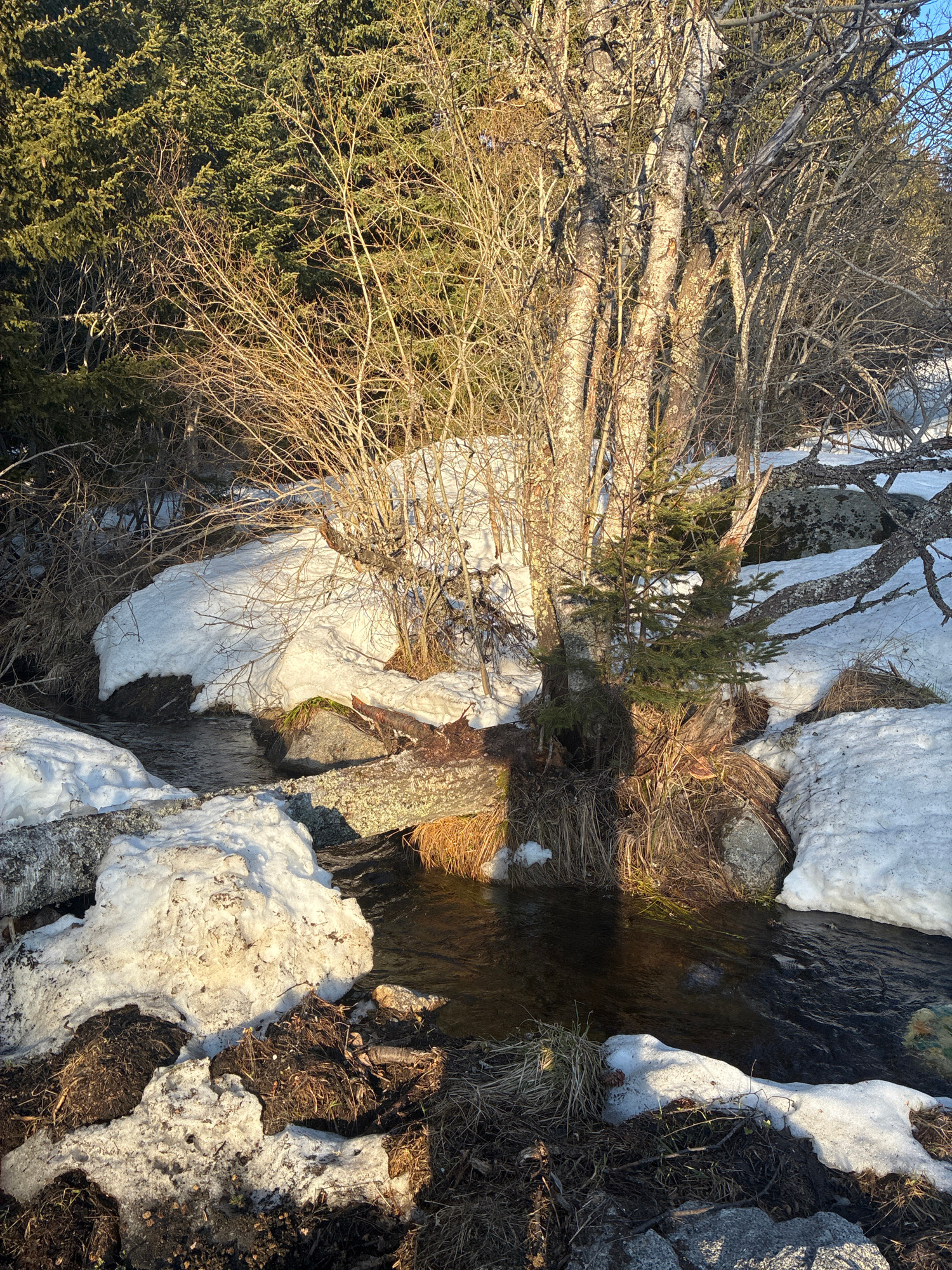 The image depicts a stream running through a snowy, rocky landscape. Melting snow is visible along the stream banks. Trees, both evergreen and deciduous with bare branches, are present. The location i…read more