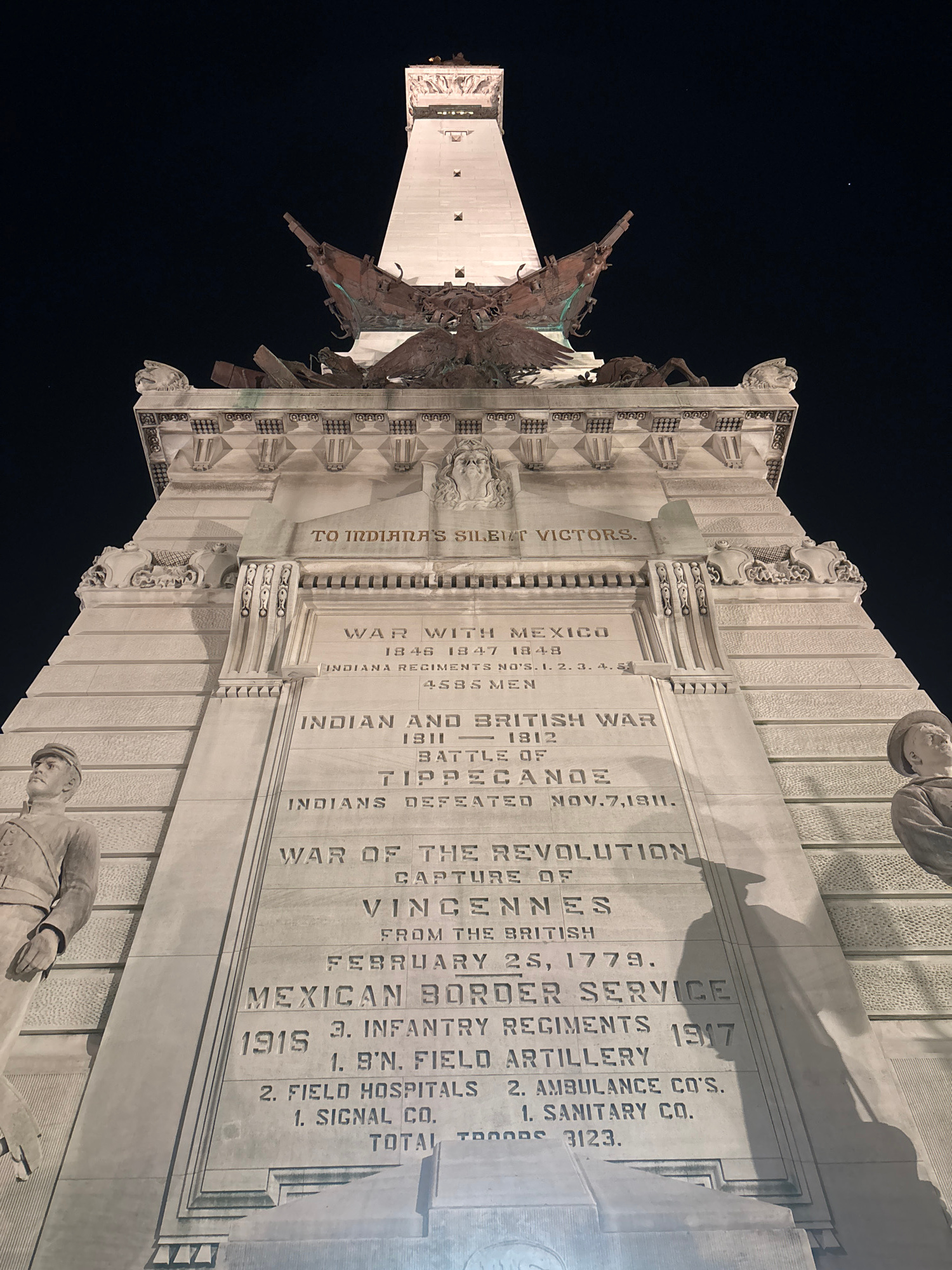 The image depicts the Indiana World War Memorial in Indianapolis, United States of America. A towering white monument dominates the night sky. In the foreground, a portion of the memorial's base is vi…read more