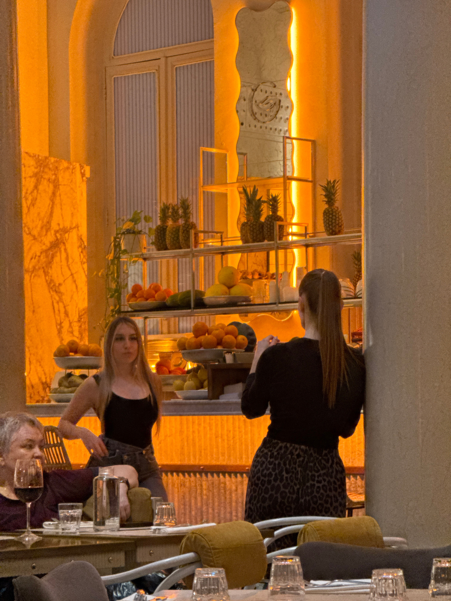 The image captures a restaurant scene in Rome, Italy. Two women and a man are present. One woman, with blonde hair, is wearing a black top and gray jeans. Another woman is standing, wearing a black to…read more