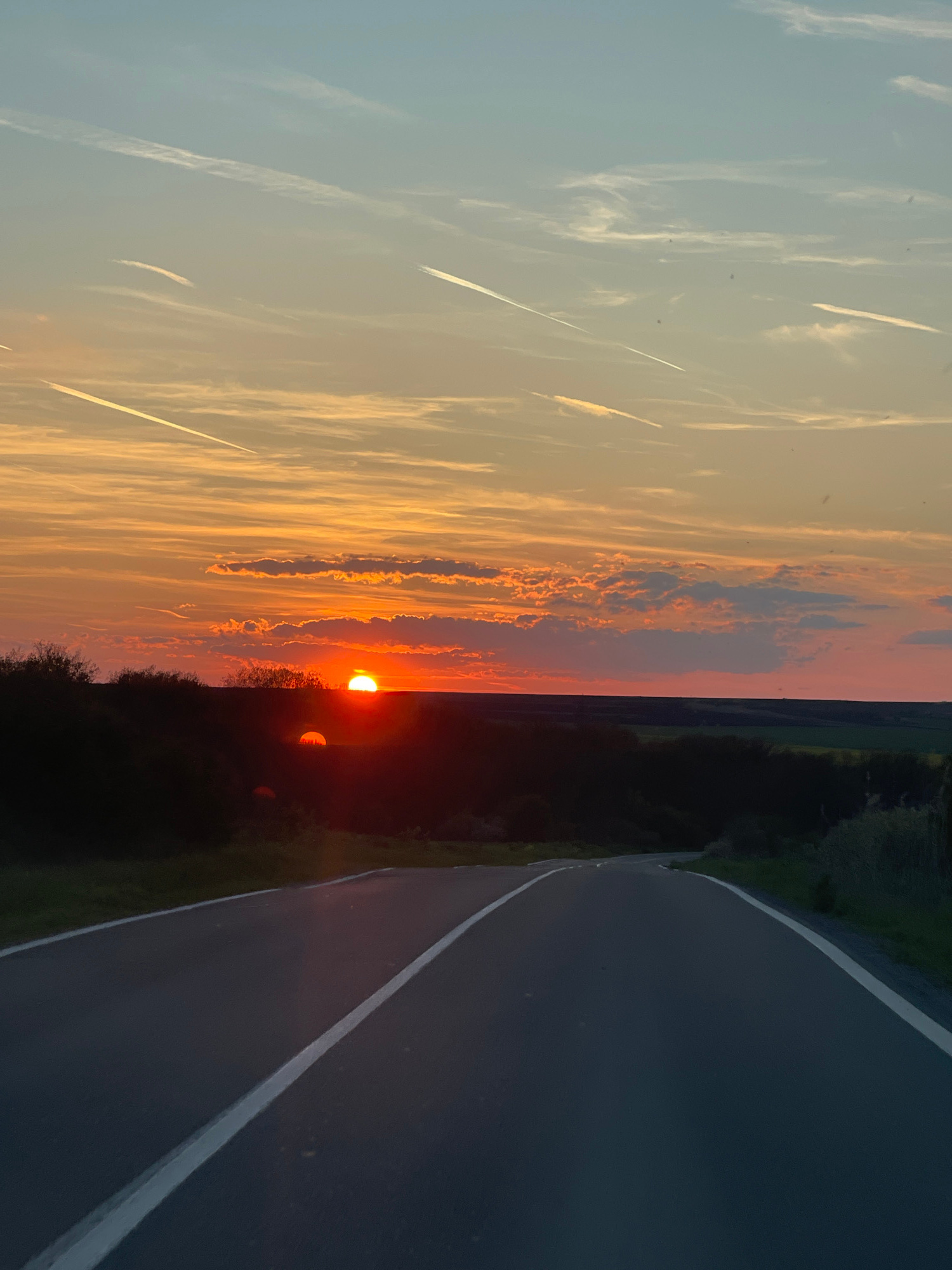The image depicts a sunset along a road. The road curves slightly to the right of the frame and is paved with a white line marking the edge. To the right of the road is dark vegetation, likely trees o…read more